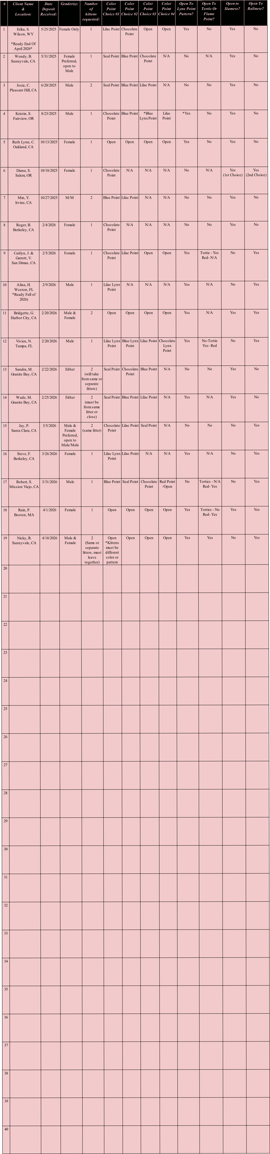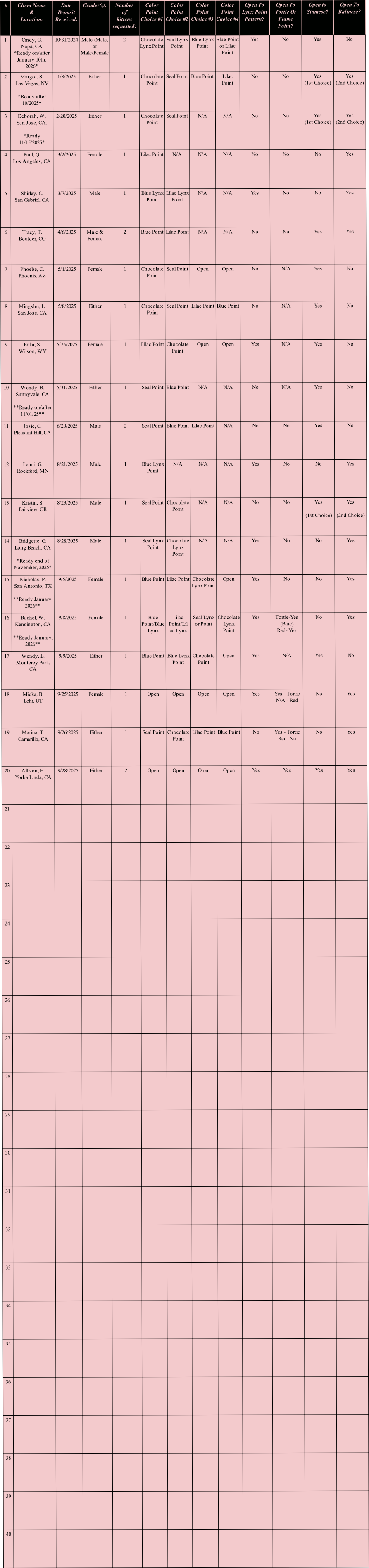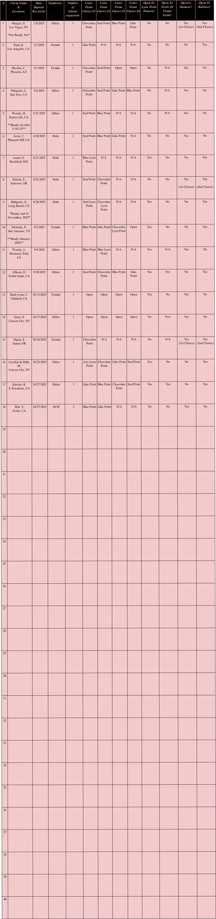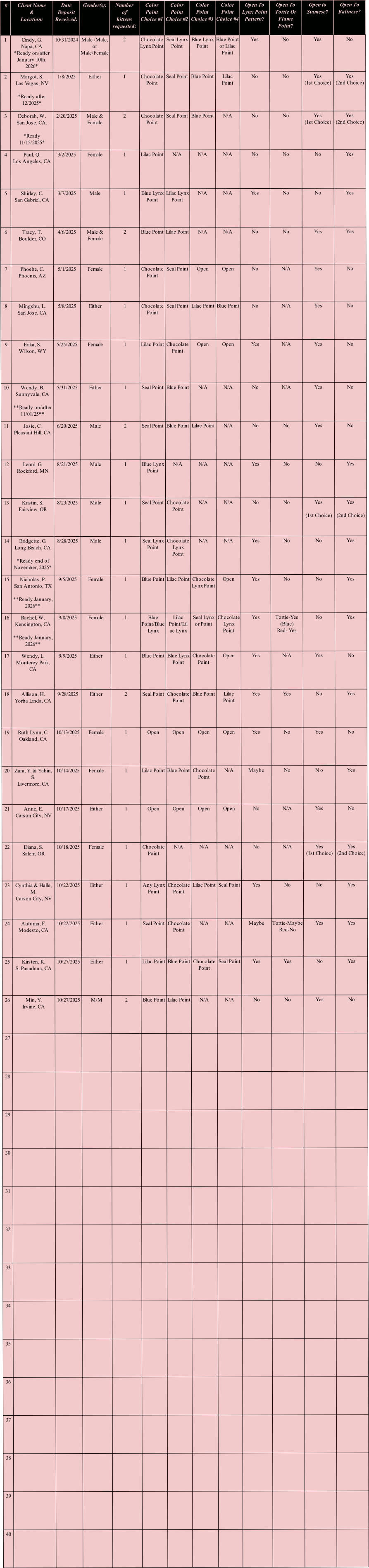 2. Clients may change or update their preferences for breed, gender, or color point, or add more kittens (limited up to 3 per entry) anytime at breeders discretion. *Separate deposit required per additional kitten, waiting list client must place the additional deposit before a kitten is formally offered/accepted.
