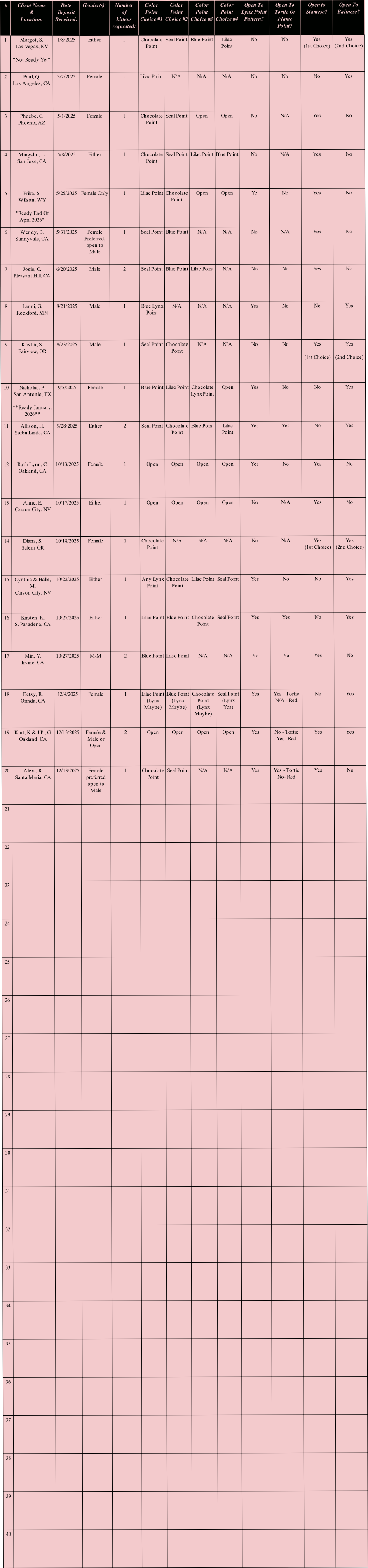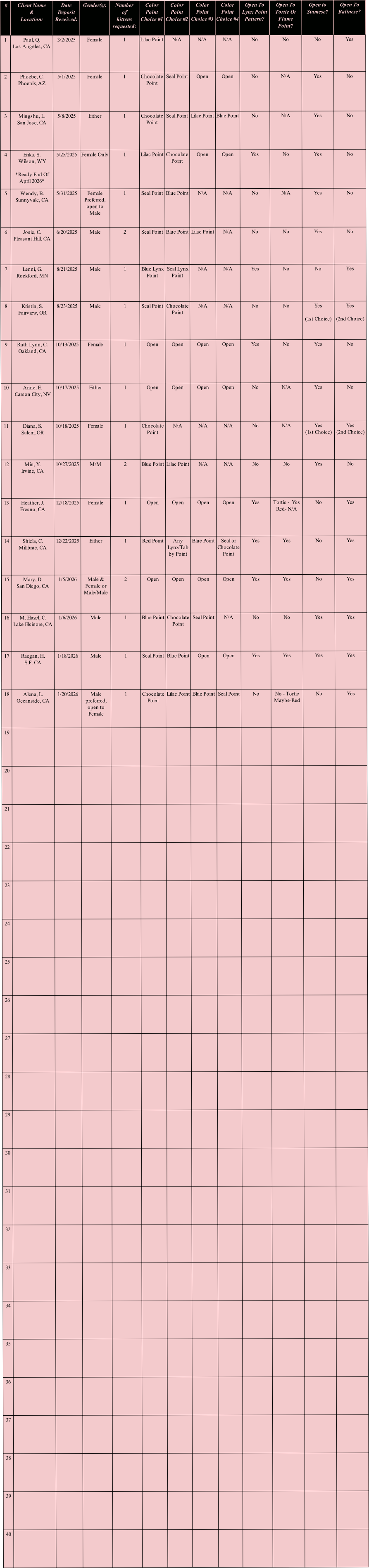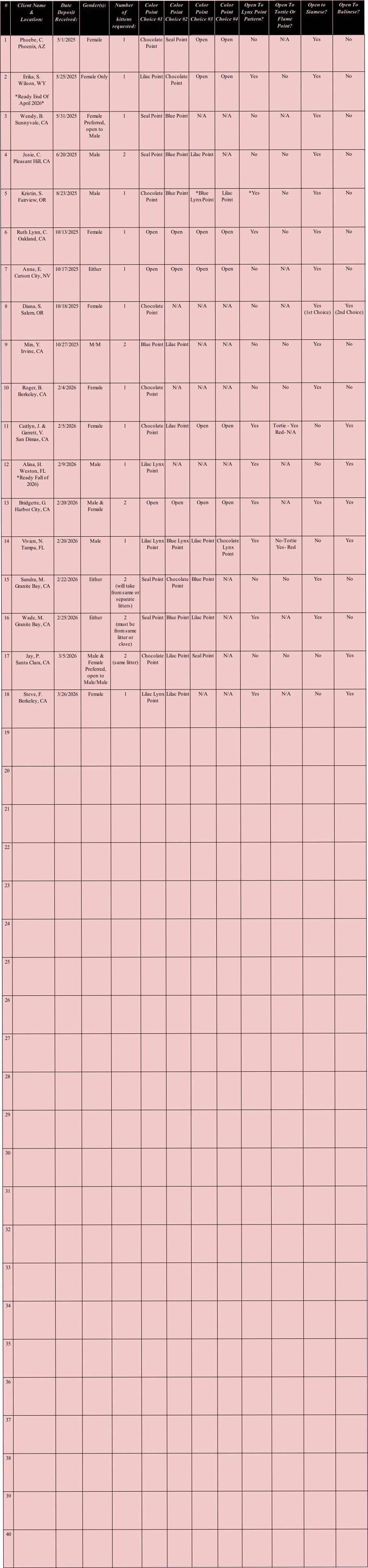 2. Clients may change or update their preferences for breed, gender, or color point, or add more kittens (limited up to 3 per entry) anytime at breeders discretion. *Separate deposit required per additional kitten, waiting list client must place the additional deposit before a kitten is formally offered/accepted.