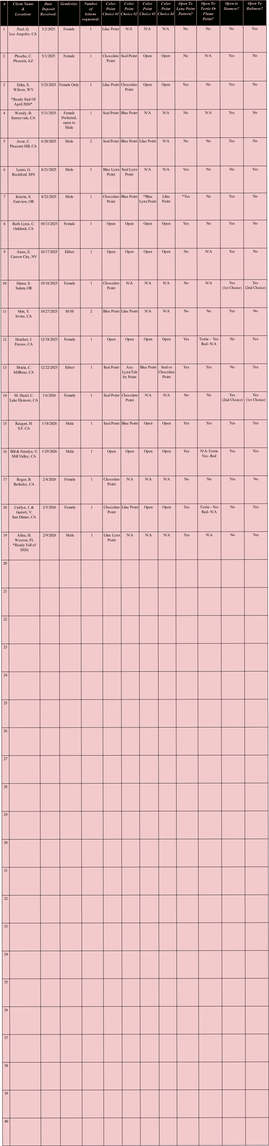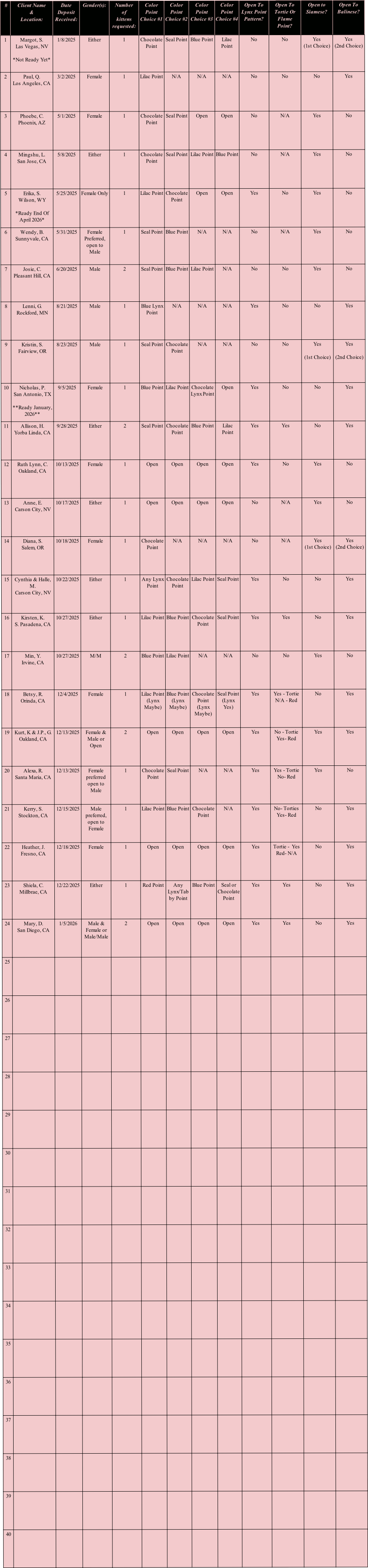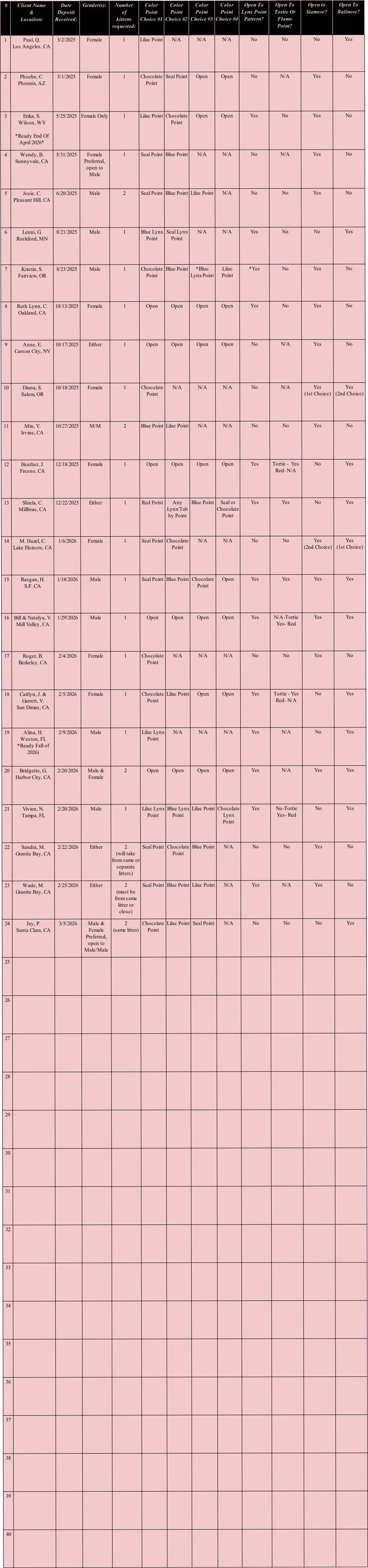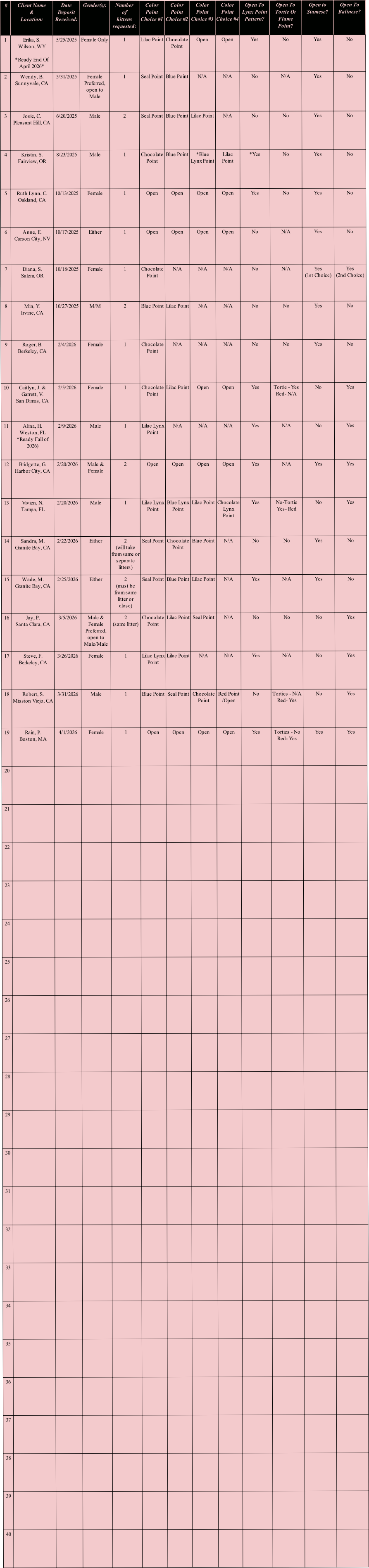 2. Clients may change or update their preferences for breed, gender, or color point, or add more kittens (limited up to 3 per entry) anytime at breeders discretion. *Separate deposit required per additional kitten, waiting list client must place the additional deposit before a kitten is formally offered/accepted.